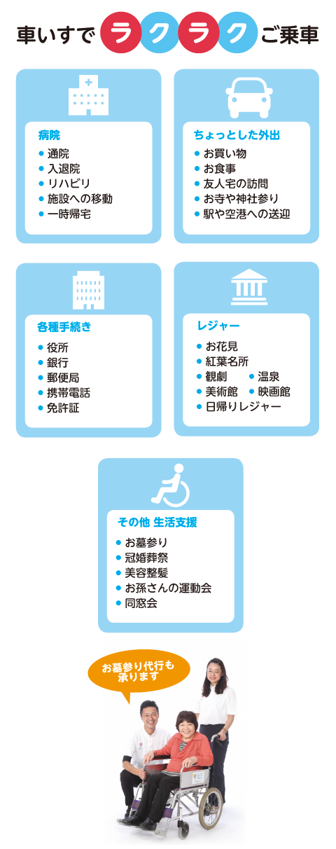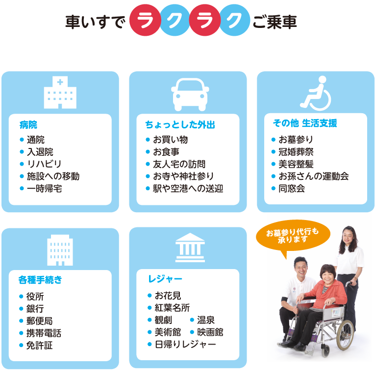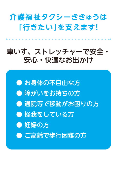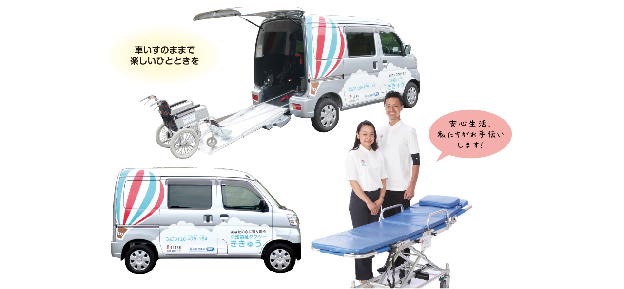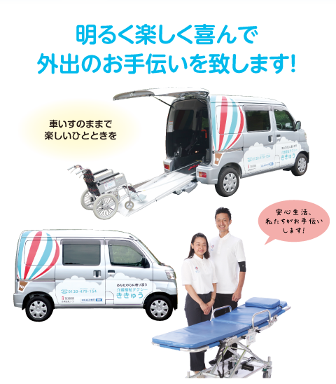 病院やお買い物、役所といったあらゆるお出かけを介護福祉タクシー ききゅうはお手伝いします!